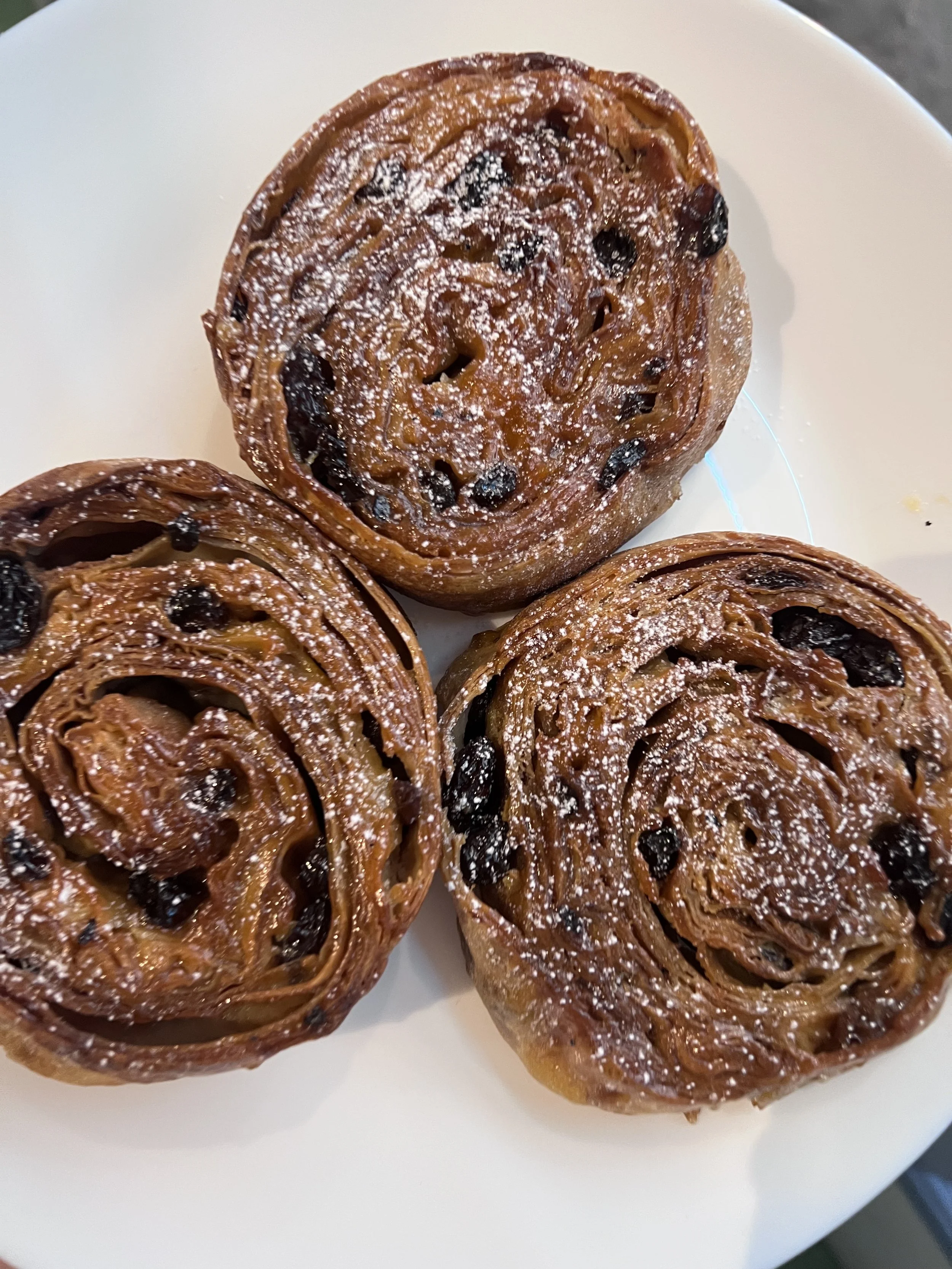 Ten layers of thin crêpes with homemade crème pâtissière, buttery richness, and sweet raisins — all the flavours of pain aux raisins, but in crêpe form.